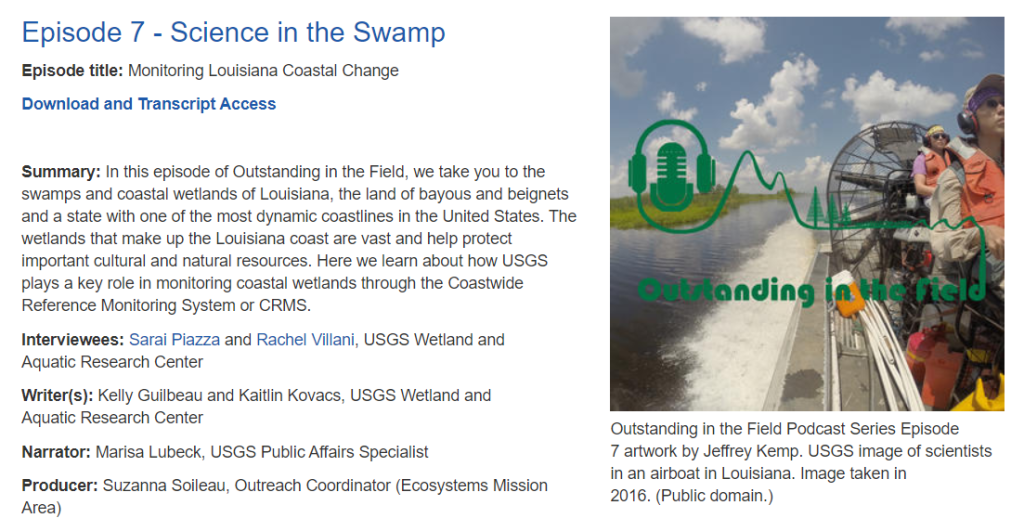 Kelly, want to venture out of the visual world and into the spoken world for the sake of the swamps? You know I immediately said yes to this project to produce a script for the USGS Ecosystems Mission Area’s podcast series. I interviewed the scientists who work on Louisiana’s Coastwide Reference Monitoring System and wrote up the script to capture their work in the field. My colleagues put together the recording and helped to promote it. The team effort was worth it!